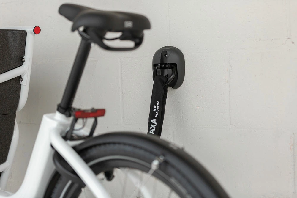 Les cambrioleurs ciblent de plus en plus les hangars ou les garages. Il est donc important d’attacher les vélos à un objet fixe, même dans ces endroits. Cela est possible grâce à l’ancre AXA. L’ancre convient pour un montage au mur ou au sol et peut être utilisée aussi bien à l’intérieur qu’à l’extérieur. Une chaîne permet ensuite d’attacher le vélo à l’ancre en acier.